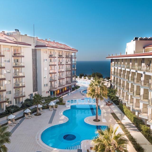 Cirka en kilometer fra den travle by Kusadasi finder du Hotel Ramada & Suites by Wyndham Kusadasi. En gratis shuttlebus kører dig til den gyldengule private strand, som ligger cirka to kilometer fra det moderne hotel. Men du kan selvfølgelig også vælge at ligge ved den store pool, hvis du vil solbade. Derudover har hotellet meget at byde på. Leder du efter en måde at starte din feriedag aktivt på? Så kan du f.eks. træne i fitnesscentret. De små vil ikke kede sig et øjeblik i miniklubben, hvor de vil blive underholdt af det entusiastiske personale. Der er også flere rutsjebaner og en legeplads hvor børnene kan hygge sig på. Desuden bor du på all inclusive-basis, hvilket sikrer en ubekymret ferie!