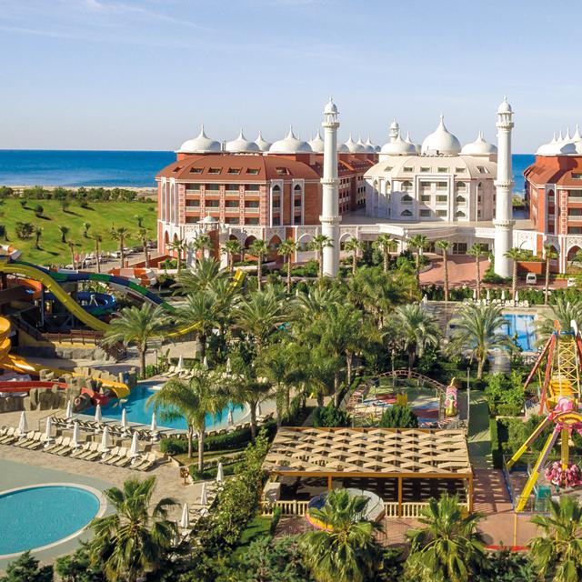 Hotel Royal Taj Mahal er et luksuriøst Ultra All Inclusive hotel beliggende i dejlige omgivelser direkte ned til stranden, ca. 5 kilometer fra den historiske by, Side. Hotellet slog for første gang dørene op i 2015 og har en imponerende arkitektur inspireret af det indiske mausoleum tempel, hvilket bygningen og indretningen bærer sit præg af. Taj Mahal består af et dejligt stort poolområde med hele 6 swimmingpools og vandland med i alt 9 vandrutsjebaner. Her er forskellige restauranter og barer. Hvad enten du er til afslapning eller aktiv ferie, er der på Taj Mahal noget for enhver smag. Du kan b.la. nyde godt af hotellets wellnes center, der består af et dejligt, indbydende spaområde, eller forskellige sportsaktiviteter som vandsport og tennis. I wellness centeret finder du også en indendørs swimmingpool, hvis det enten er for varmt eller for koldt udenfor. Da opholdet er med Ultra All Inclusive er både måltider, snacks og drikkevarer inkluderet. Om du er voksen eller barn, er der noget at give sig til for enhver smag på Taj Mahal. Vi anbefaler Royal Taj Mahal til både voksne, unge og børnefamilier, der ønsker at bo i komfortable omgivelser.
